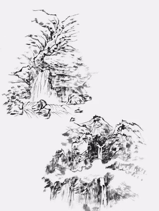 瀑布贯穿山水全局,最能体现水的动势。画瀑布,还要绘其源头,同时画出飞奔喷射的动势。古人画瀑布多以流畅的线条表现出水的流动感与速度感, 并将两侧的山石染暗以衬托白练之美。